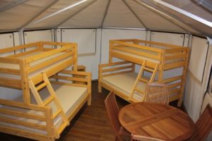 A yurt is a heated, roofed shelter. Each yurt can house 6 students (2 double beds and 2 single beds) and comes with an outdoor BBQ for cooking.